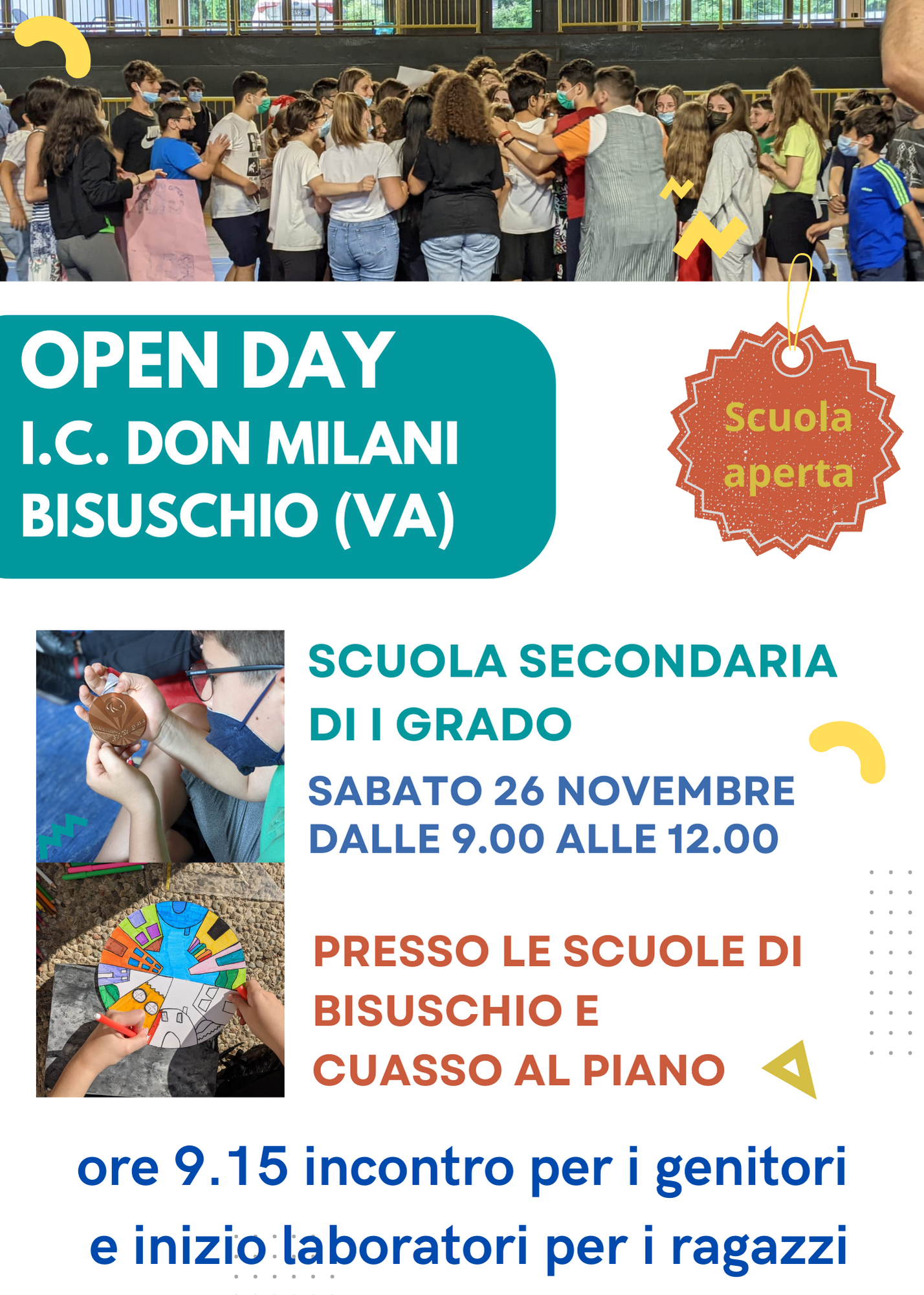 L'Istituto Comprensivo "Don Milani" è lieta di invitare quanti interessati all'Open Day della scuola secondaria di I grado che si terrà sabato 26 novembre p.v. con il seguente programma:
