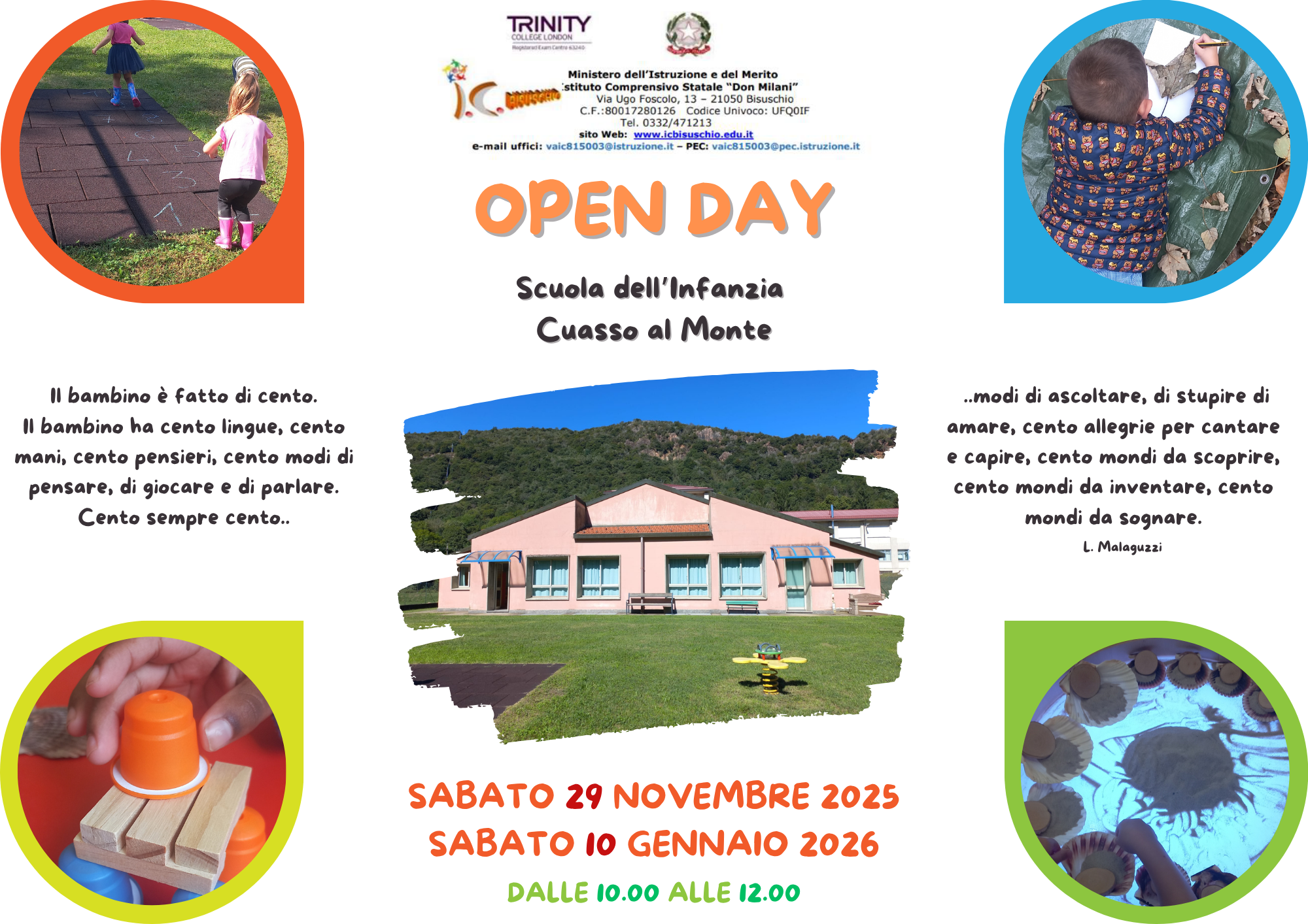 L'Istituto Comprensivo "Don Milani" è lieta di invitare quanti interessati all'Open Day della scuola dell'Infanzia che si terrà sabato 29 NOVEMBRE 2025 e sabato 10 GENNAIO 2026 presso il plesso della Scuola dell'Infanzia di Cuasso al Monte dalle ore 10.00 alle ore 12.00.